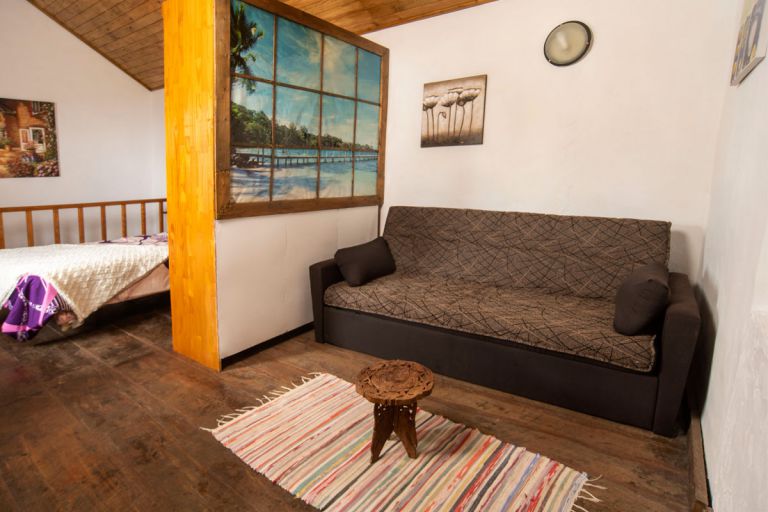 | Sowohl von außen als auch von innen ist das offene Schlafzimmer über eine Treppe zu erreichen. Es ist mit einem 140 cm breiten Doppelbett, einer 130 cm breiten Schlafcoach und einem Kleiderschrank ausgestattet. | |||||