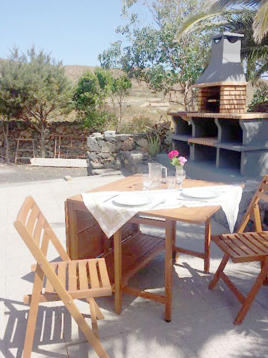 | Vor der Fincas befindet sich die mit Gartenmöbeln und Sonnenschirm ausgestattete Terrasse und einen großzügigen Grillplatz mit einem gemauerten Grill. Ein Pkw Einstellplatz steht direkt am Haus zur Verfügung. |