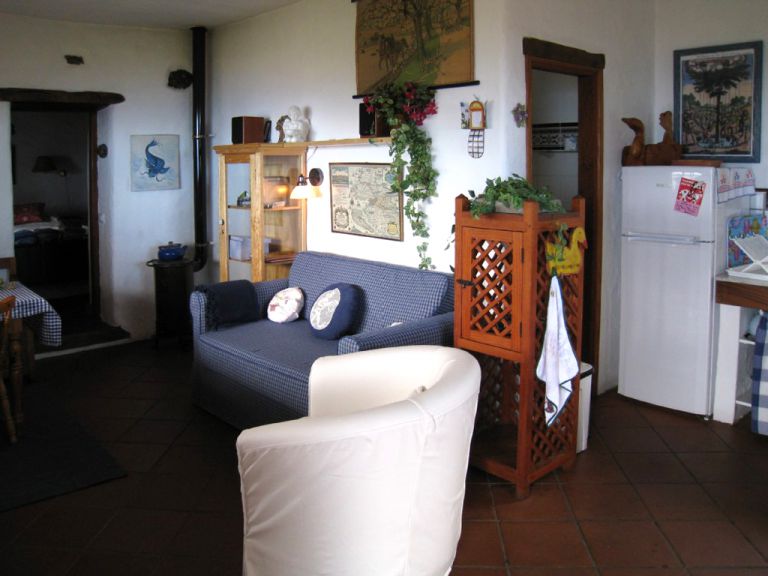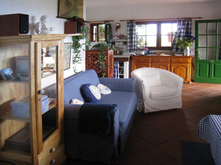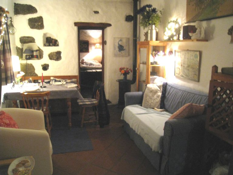 | Die Finca umfaßt ca. 73 qm und ist für 2 bis 3 Personen geeignet. Der Wohnraum mit komplett eingerichteter Küche mit Backofen, Gefrierkühlschrank, Mixer, Kaffeemaschine, Schlafmöglichkeit für eine dritte Person, Musik und Bücher verfügt über eine gemütliche Eßecke und einen rustikalen, geschlossenen Kaminofen für kühlere Abende. Von dort aus gelangen Sie in das Schlafzimmer mit zwei Einzelbetten und einer denkmalgeschützten Sabinaholzdecke (zusätzliches Beistellbett für ein Kind möglich) und in das geräumige Badezimmer mit Dusche, Waschbecken, WC und Fön. Im Außenbereich befindet sich eine gemütliche und windgeschützte Stein Terrasse mit herrlichem Ausblick. Sitzkissen und Decken stehen zur Verfügung. |