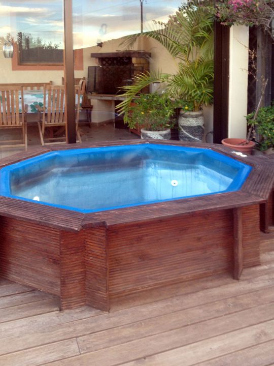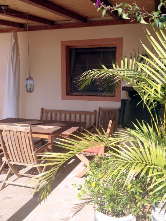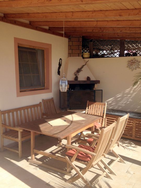 | Vor dem Ferienhaus befindet sich eine teilweise überdachte Terrasse mit Sonnenliegen und Gartenmöbeln. Neben der Terrasse befindet sich der Whirlpool. An der hinteren Seite des Ferienhauses, völlig separat, befindet sich ein kleiner Anbau, der von einer Person bewohnt wird, die tagsüber weitgehend außer Haus ist. | |||||