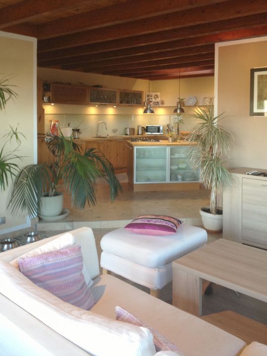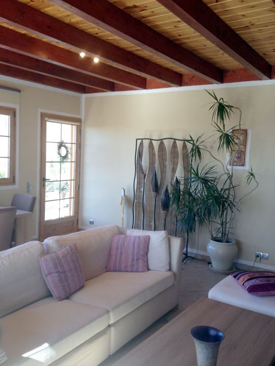 | Das Ferienhaus besteht aus einem Wohnraum mit Couchgarnitur, SAT - TV, DVD - Player und Internetzugang. Die Holzeinbauküche ist zum Wohnraum hin offen und verfügt über einen Gasherd, Backofen, Geschirrspüler und Mikrowelle. | |||||