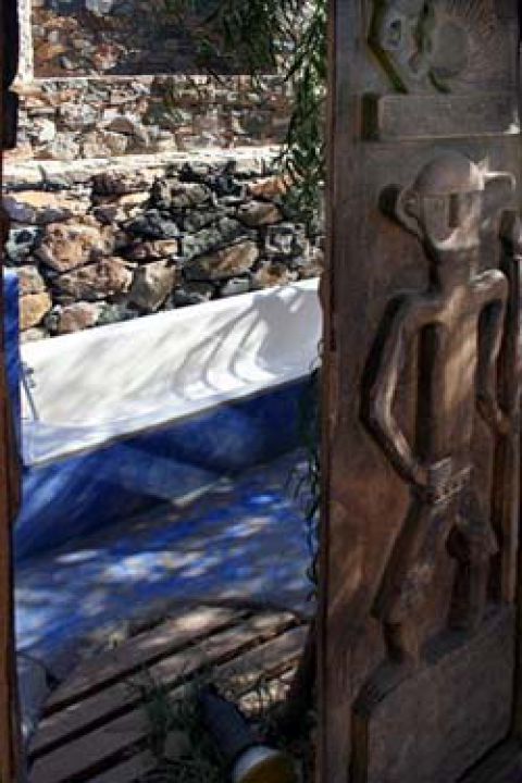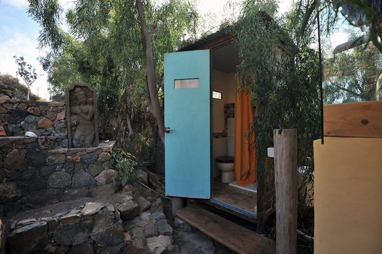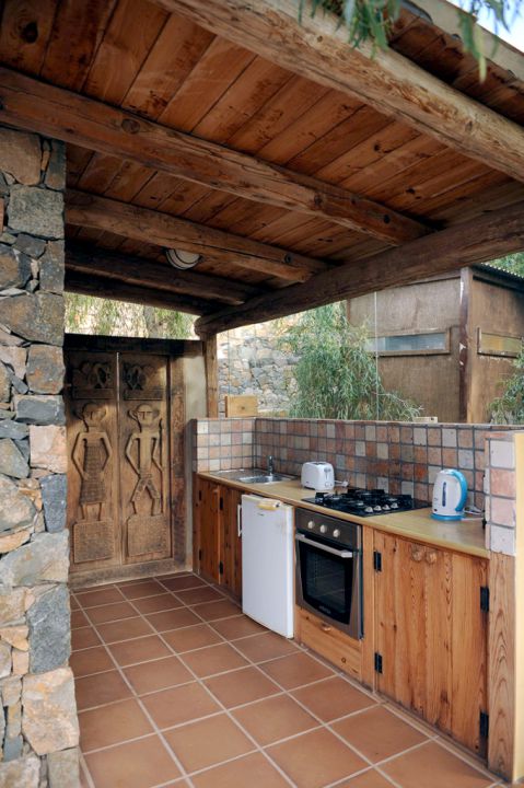 | So verfügt das Ferienhaus über eine überdachte Außenküche mit einem Vierplattenherd, Kühlschrank und Backofen, Kaffeemaschine, Wasserkocher sowie Toaster. Ein sichtgeschütztes Außenbad befindet sich in grüner Idylle. Das Außergewöhnlichste dieser wohl einmaligen Sanitäreinrichtungen ist die in einem kleinen Turm untergebrachte, sichtgeschützte Toilette. Für kühlere Tage steht zusätzlich ein kleines Duschbad mit Toilette in einem Holzanbau zur Verfügung. | ||