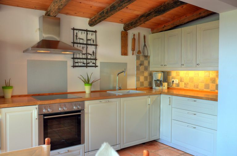 | Die in den Wohnraum integrierte Einbauküche ist komplett ausgestattet. Neben einem Ceran-Kochfeld mit Dunstabzug, ist die Küche mit einem Backofen, großem Kühlschrank mit Eisfach, einer Spülmaschine, Kaffeemaschine sowie einem Wasserkocher ausgestattet. | ||