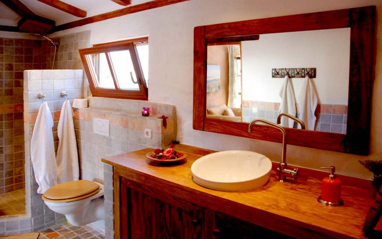 | Das Bad mit Marmorfliesen ist vom Schlafzimmer und von Wohnbereich aus begehbar. | |||||