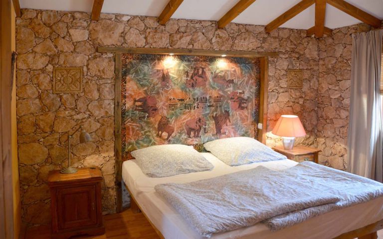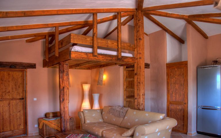 | Ein großes separates Schlafzimmer mit Doppelbett (180 x 200) und einem geräumigen Kleiderschrank sorgt für eine angenehme Nachtruhe. Bei einer Belegung von 3 bis 4 Personen ist im Wohnbereich ein rustikales und massives Hochbett mit einer 160 x 200 cm großen Matratze. | |||||
