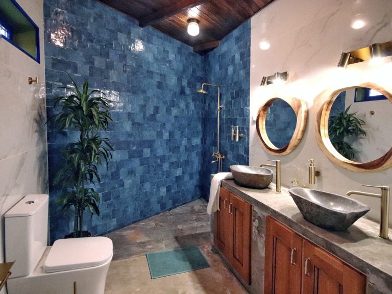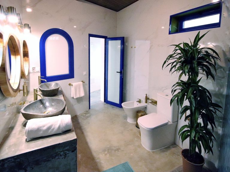 | Darüber hinaus stehen Ihnen zwei Schlafzimmer mit Doppelbetten (160 x 200) zur Verfügung. Das Haus besitzt ein Badezimmer. Das moderne Bad mit Tageslichtfenster und ebenerdiger Dusche verfügt über WC, Bidet sowie 2 Waschbecken mit Unterschränken. | ||
