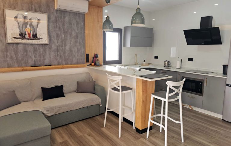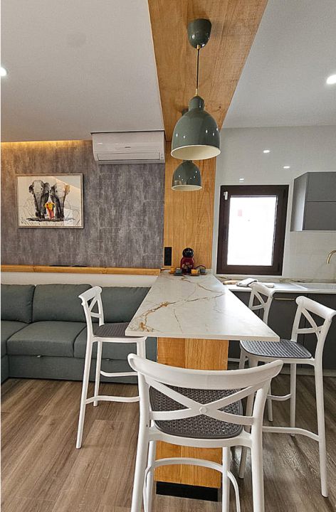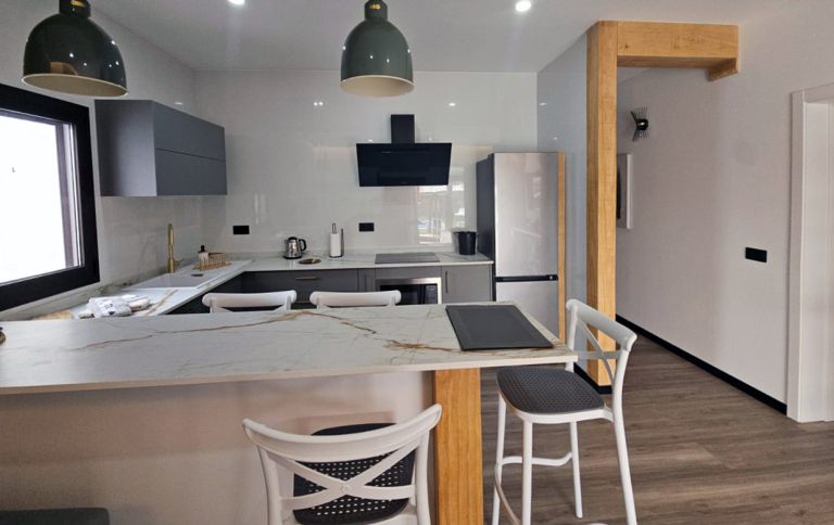 | Der modern gestaltete, offene Wohnraum ist ausgestattet mit einer bequemen Eckcouch und verfügt über einen großen SAT-TV in Wandmontage. Der angrenzende, offene Küchenbereich ist komplett ausgestattet und verfügt über einen Geschirrspüler, ein Cerankochfeld mit Backofen, Dunstabzug, einem Kühlschrank mit Gefrierfach, zwei Kaffeemaschinen, Wasserkocher. Die Integrierte Esstheke ist geräumig und bietet Platz für vier Personen. Im separaten Haushaltsraum befindet sich die Waschmaschine. |
