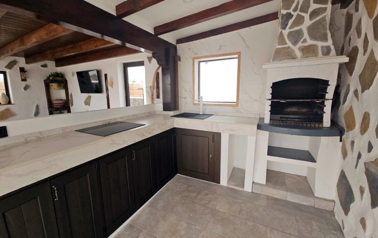 | Weiterhin bietet der Aussenbereich eine geräumige Aussenküche mit gemauertem Grillplatz und verfügt über einen separatem Essbereich, bestehend aus einem Tisch mit vier Stühlen. |