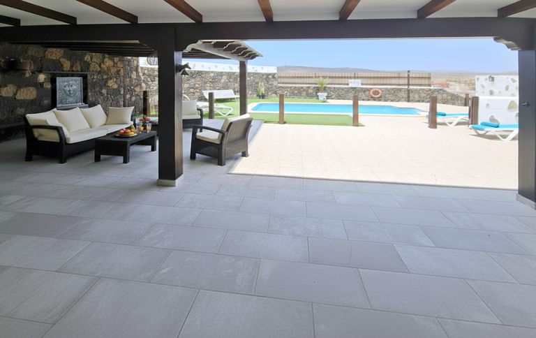 | Der großzügige, um den Pool herum gestaltete, teilweise überdachte Terrassenbereich ist mit Sonnenliegen, Tischen und gepolsterten Gartensitzmöbeln ausgestattet. | |||||