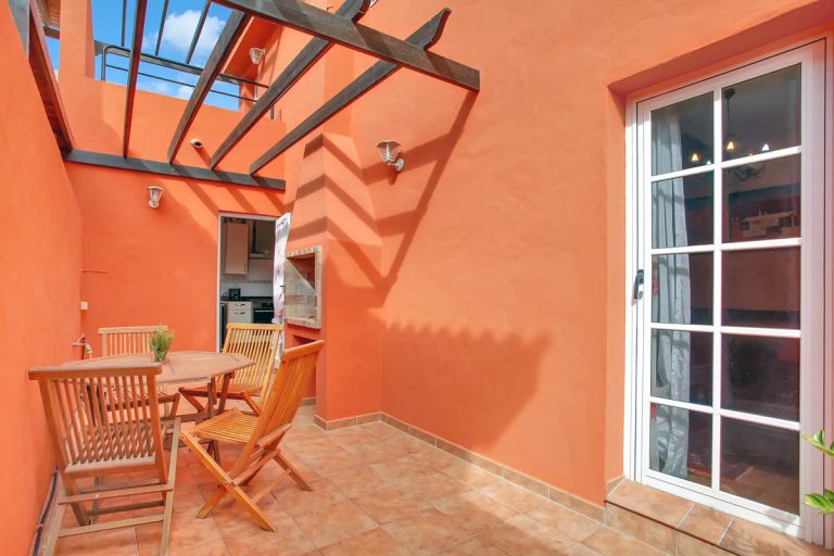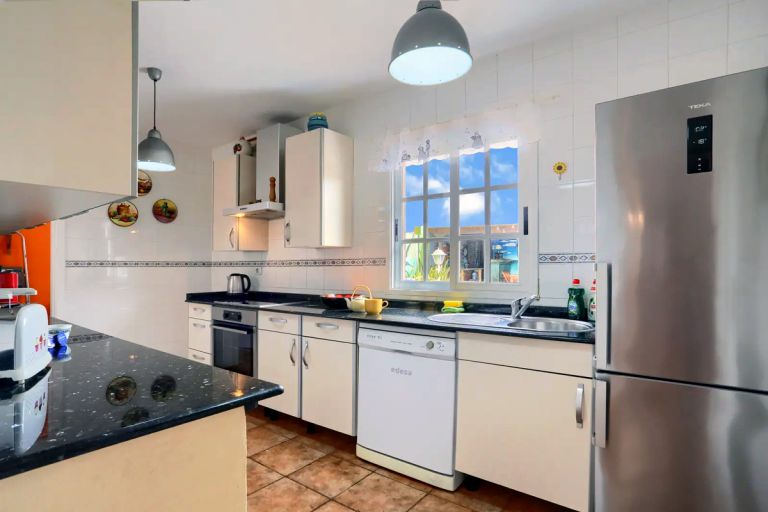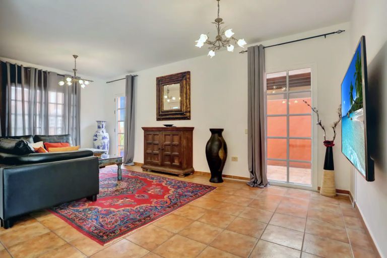 | In ca. 50 Meter Entfernung gibt es in der Anlage einen großen Gemeinschaftspool in Südlage mit Sonnenliegen, den Sie nutzen können. Mit 150 qm Wohnfläche, drei Schlafzimmern und zwei Bäder, ist das Ferienhaus für maximal 6 Erwachsene und 2 Kleinkinder geeignet. Genießen Sie das angenehme Klima Fuerteventuras im großzügigen Aussenbereich, der von einem weitläufigen privaten Garten umgeben ist. Der zum Teil überdachte Terrassenbereich bietet genügend Sitzplätze und Sonnenliegen. Im oberen Bereich des Ferienhauses befindet sich eine weitere, kleinere Terrasse mit Sitzmöbeln. |
