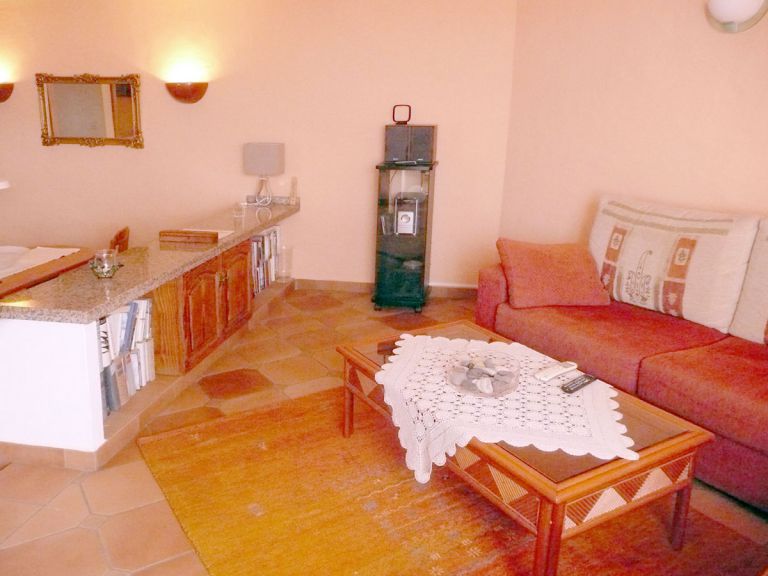 | Vom Wohnraum aus gelangen Sie durch eine große Glastür auf die mit Gartenmöbeln und Sonnenliegen ausgestattete Terrasse, die Ihnen einen schönen Meerblick bietet. Das Wohnzimmer mit einer halbintegrierten und gut ausgestatteten Einbauküche verfügt über eine Couchgarnitur, eine Eßtisch, SAT-TV und Stereoanlage. |