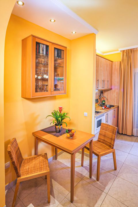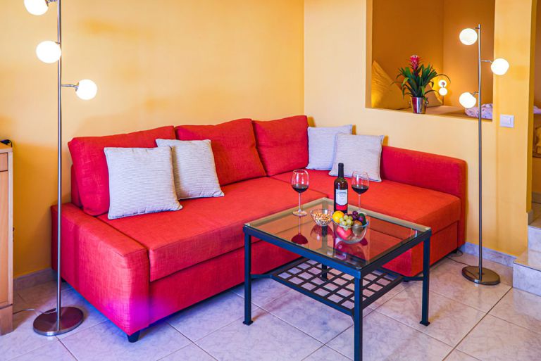 | Der Wohnraum ist mit einer Couch ausgestattet, einem kleinen Eßtisch und einer Küchenzeile mit Cerankochfeld, Mikrowelle und Kühlschrank. Ebenso vorhanden sind ein Wasserkocher, Kaffeemaschine, Toaster, Eierkocher und ein Tischgrill. | ||