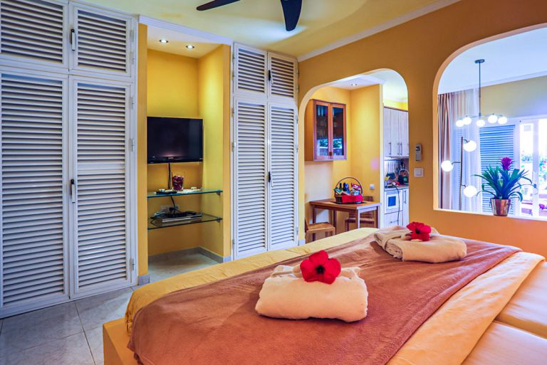 | Bettwäsche, Handtücher und Strandlaken in guter Qualität sind ausreichend vorhanden, ebenso zwei Bademäntel. Selbstverständlich gibt es einen Safe. | ||