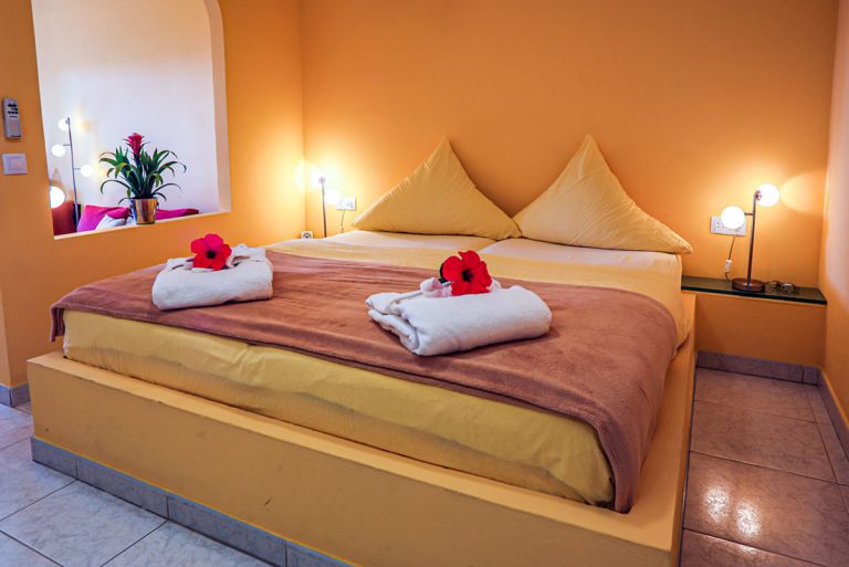 | Der Schlafbereich ist vom Wohnraum optisch abgeteilt und verfügt über ein Doppelbett, SAT -TV, DVD- und CD - Player und einen großen Einbauschrank. | ||