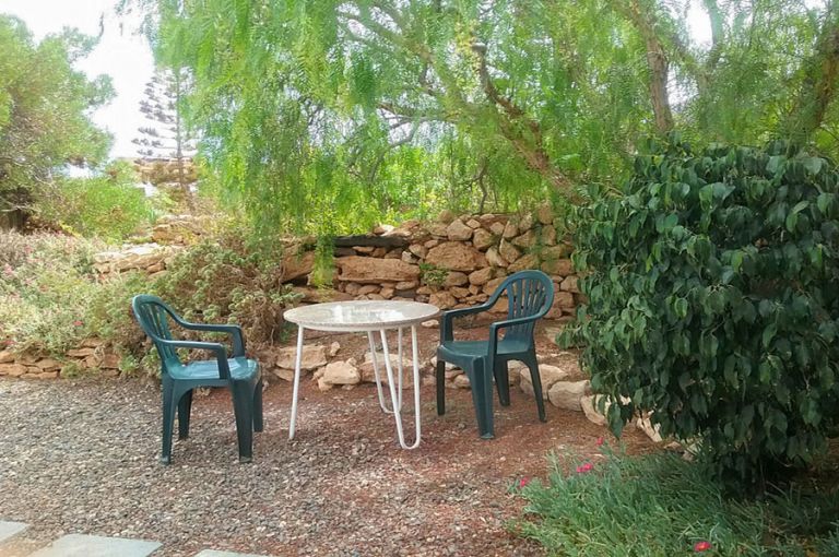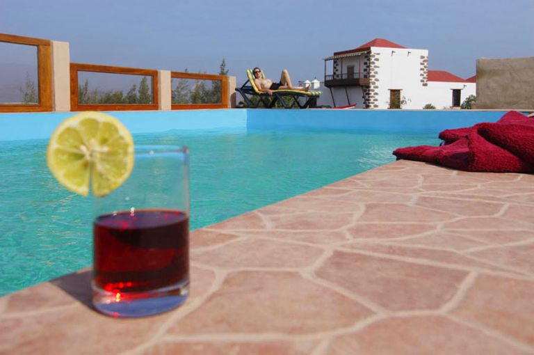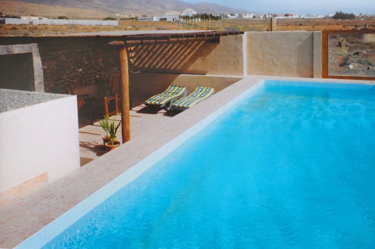| Die Finca liegt am Rande eines kleinen Dorfes, in der Inselmitte. Die gesamte Poolanlage umfaßt 140 qm. Das Wasserbecken mißt 5,50 x 10,00 Meter. Die gesamte Anlage ist durch Mauern sichtgeschützt und durch zusätzliche Glaswände auch windgeschützt. Zu der Anlage gehört ein ca. 20 qm großer schattiger Liegeplatz mit Dusche und Umkleideraum und ein ca. 20 qm großer sonniger Liegeplatz mit Toilettenhäuschen. |