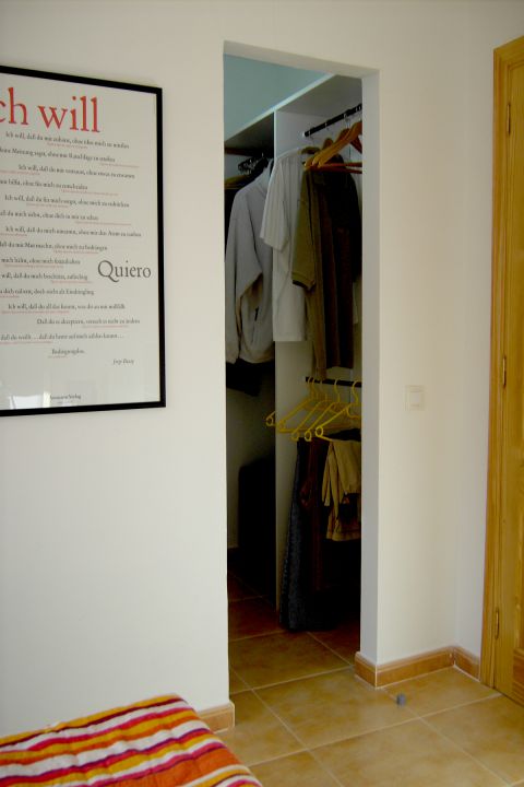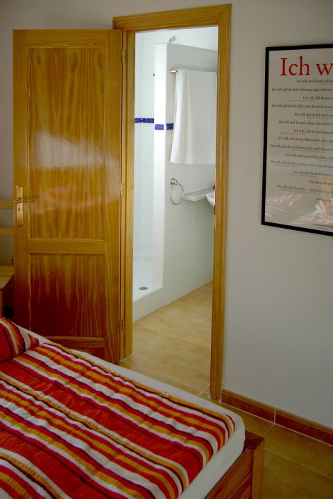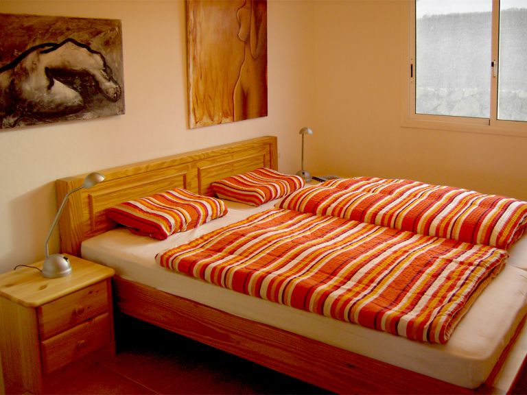 | Das geräumige und helle Schlafzimmer ist mit einem großzügigem begehbaren Kleiderschrank und einem Doppelbett ausgestattet. Das Bad ist direkt vom Schlafzimmer aus begehbar und verfügt über eine gemauerte Dusche, Waschbecken und WC. | |||||