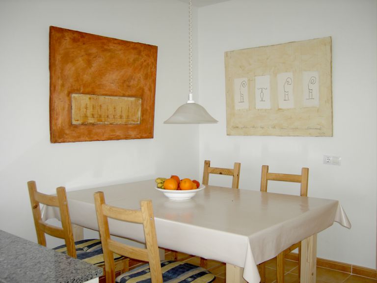 | Fünf großformatige Originalbilder der spanischen Malerin Nuria del Pino, die im Nachbarort Lajares arbeitet, geben den Räumen eine ganz besondere Note. | |||||