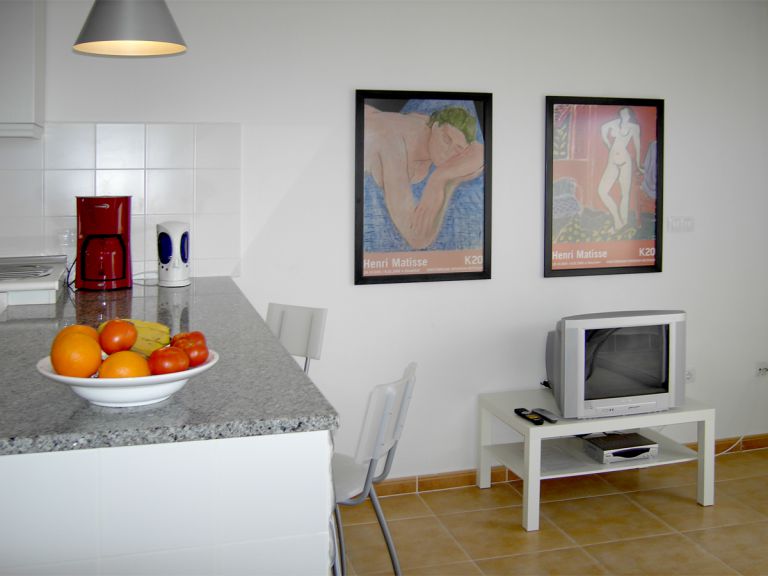 | Mit ca. 46 qm Wohnfläche ist die Ferienwohnung für 2 Persnen geeignet. Der Wohneßbereich mit einer gemütlichen Couchecke und SAT-TV mit Radio umfaßt 30 qm und erstreckt sich über zwei Ebenen. Von dort aus führen zwei Schiebetüren auf die mit Sonnenliegen und gemauerter Bank ausgestattete Terrasse, die einen weiten Blick über das Land bis zum Meer bietet. | |||||