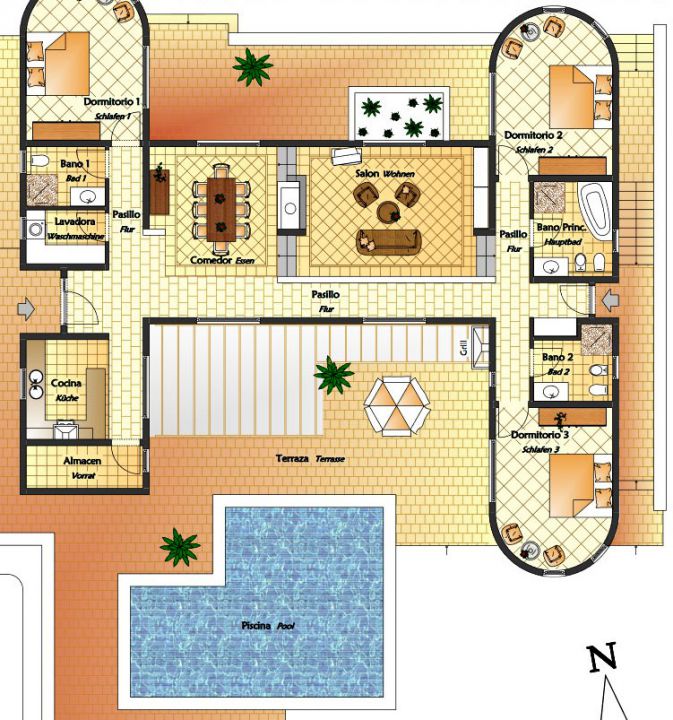 | Zwei große, teilweise überdachte Terrassen, eine davon mit einem Grillkamin und ein im inseltypischen Stil angelegter Garten, umgeben die Villa. Von der hinteren Terrasse aus haben Sie einen herrlichen Blick auf den Inselnorden, das Meer und die Insel Lanzarote. Der ca. 5 x 8 Meter große Pool ist von einer ca. 60 qm großen Sonnenterrasse umgeben. | |||||