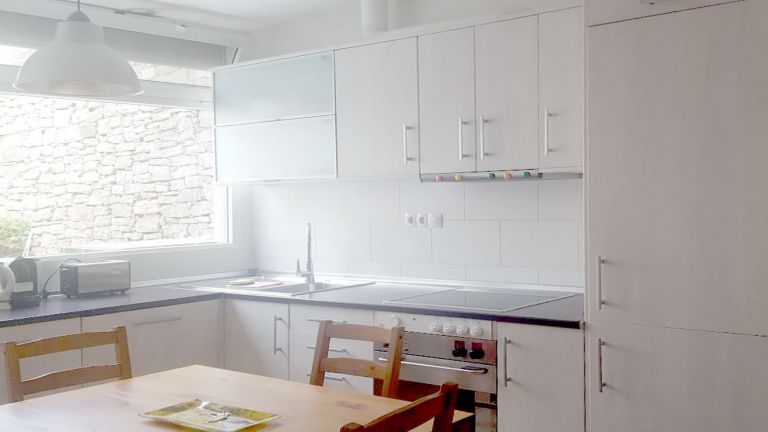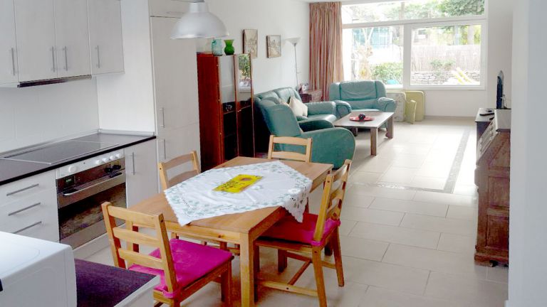 | Das Wohnzimmer ist mit einer gemütlichen Sitzgarnitur, Couchtisch und SAT-TV möbliert. Die offene Küche ist mit Cerankochfeld, Backofen, Mikrowelle, Kühlgefrierkombination, Kaffeemaschine, Toaster, Wasserkocher ausgestattet und bietet einen integrierten Essplatz mit einem Tisch und 4 Stühlen. |