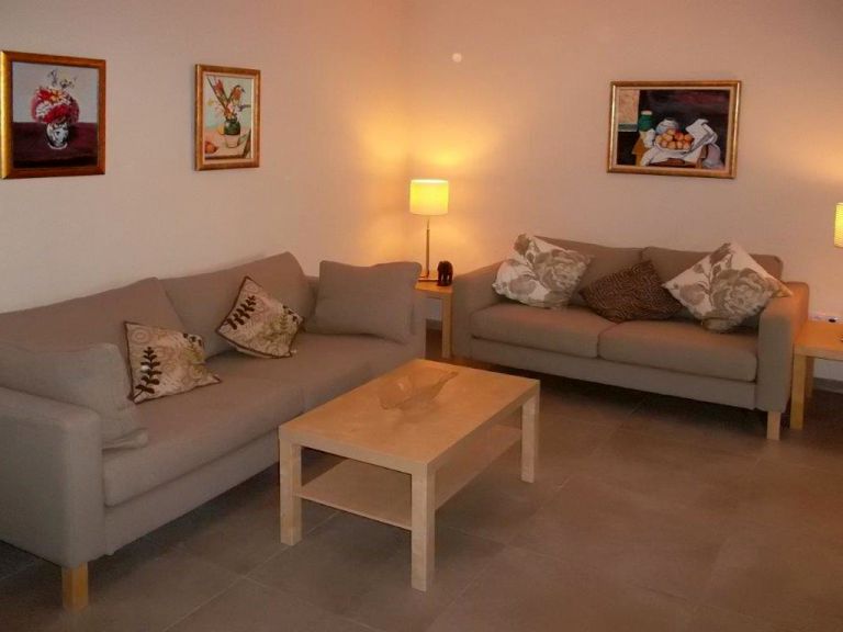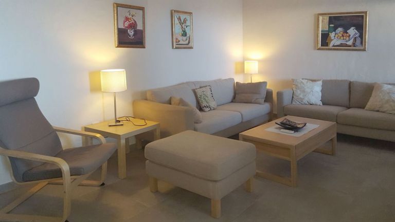 | Das dritte Schlafzimmer mit zwei hintereinander stehenden Einzelbetten und das Gäste-WC liegen in Erdgeschoß. Dort befindet sich auch der Wohnraum mit Couchgarnitur, Eßtisch und SAT-TV. Die kleine Einbauküche mit Cerankochfeld, Backofen und Kühlgefrierkombination ist durch eine Durchreiche mit dem Wohnraum verbunden. Vom Wohnraum aus gelangen Sie auf die geräumige Terrasse mit Gartenmöbeln und zwei Sonnenliegen. Eine Waschmaschine ist vorhanden. | ||