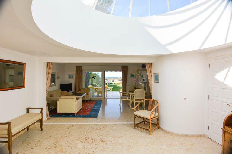 | Vom Wohnzimmer aus gelangen Sie in den Patio mit großer Glaskuppel und in die komplett ausgestattete Küche mit Mikrowelle, Backofen/Grill, Geschirrspüler und Waschmaschine. | |||||