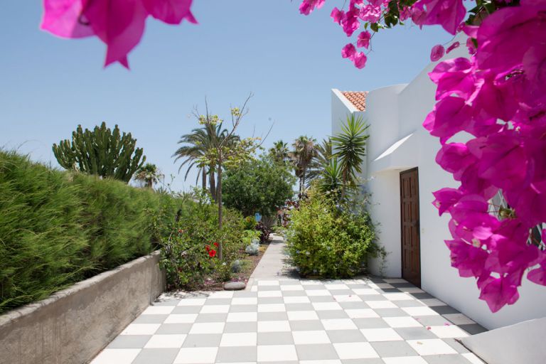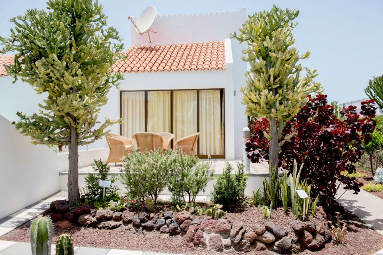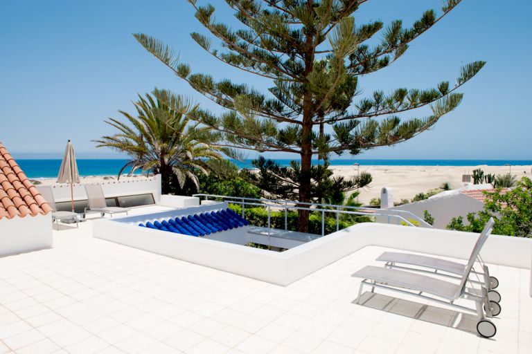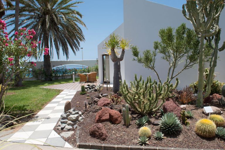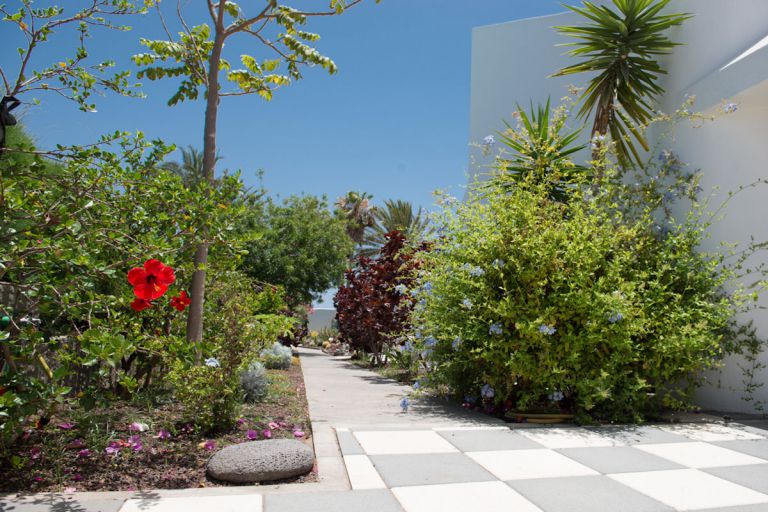 | Zum jedem Ferienhaus gehört eine Gartenterrasse mit Wiese, eine nicht einsehbare Dachterrasse mit unverbautem Blick auf die Dünen und eine kleine Innenhofterrasse. Das gesamte Anwesen ist eingebettet in einen gepflegten Kakteen- und Palmengarten. | |||||