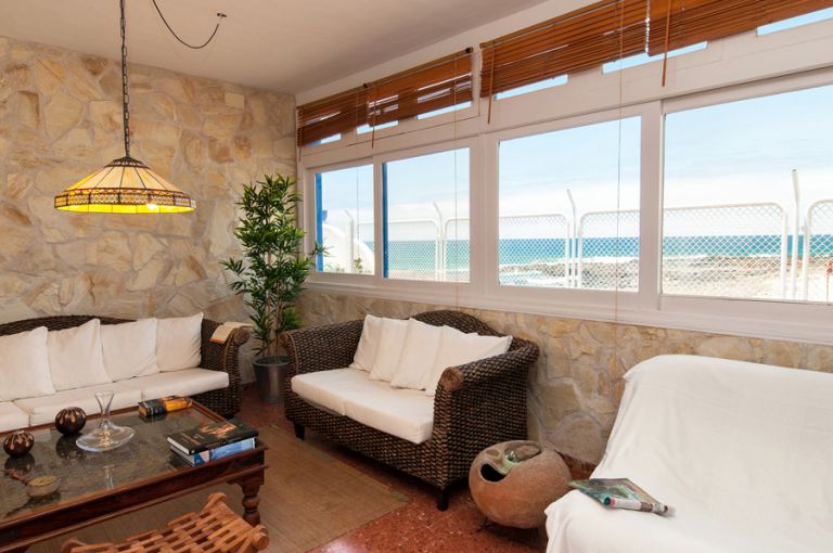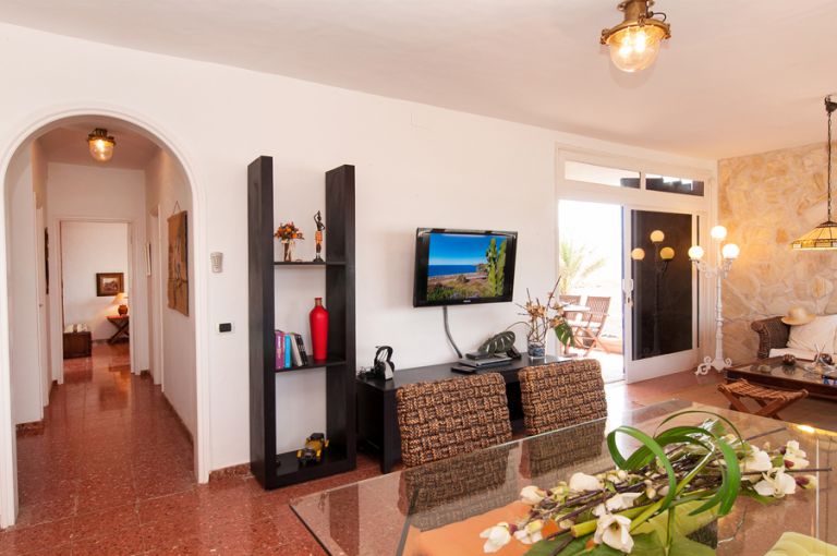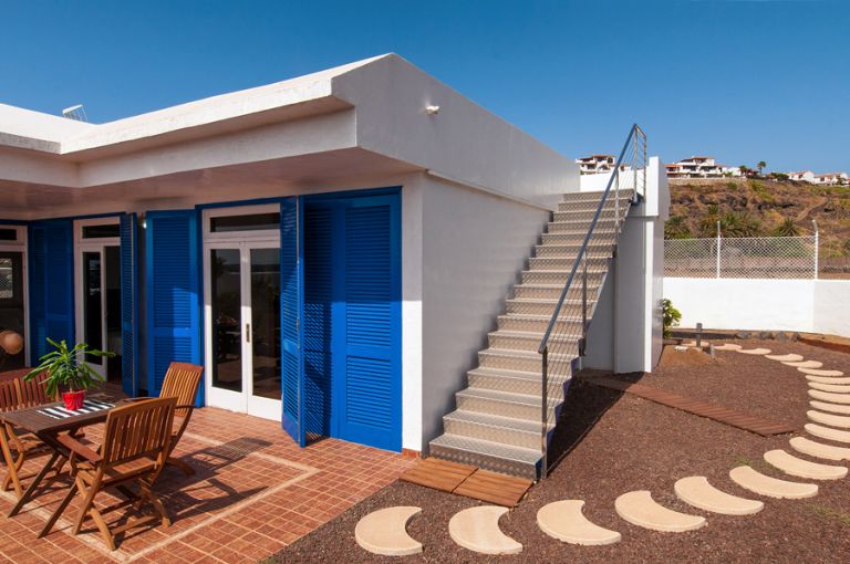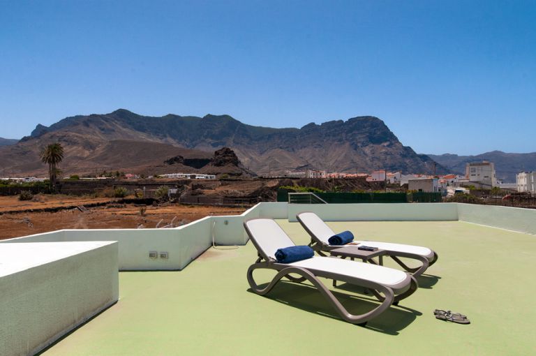 | Mit 115 qm Wohnfläche ist das Ferienhaus für 4 Personen geeignet. Es verfügt über einen gemütliches Wohnzimmer mit Meerblick, zwei Couchen, SAT-TV, DVD-Player und einem modernen Glasesstsich. Von hier aus gelangen Sie auf die schöne Terrasse mit Gartenmöbeln und Grill. | Das Ferienhaus bietet einen herrlichen Blick auf das Meer und die Insel Teneriffa mit dem Teide. | ||||