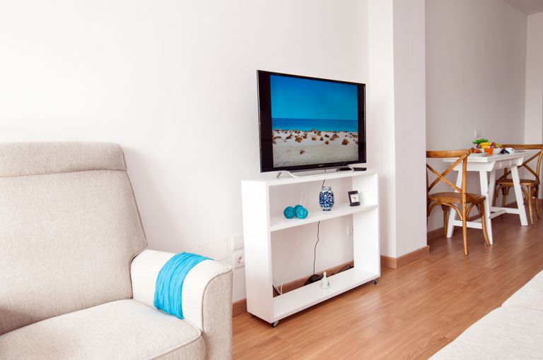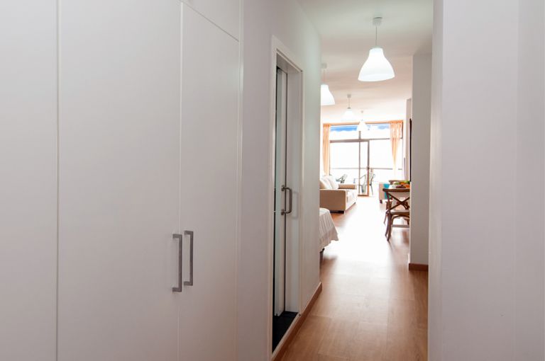 | Das Highlight dieser Wohnung ist der kleine Balkon, der einen phantastischen Ausblick auf den gesamten Strand bietet, den Sie natürlich auch in kurzer Zeit zu Fuß erreichen. | Das bequeme Doppelbett liegt etwas separiert im Flurbereich, wo sich auch das Duchbad befindet. | ||||