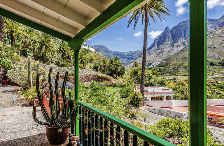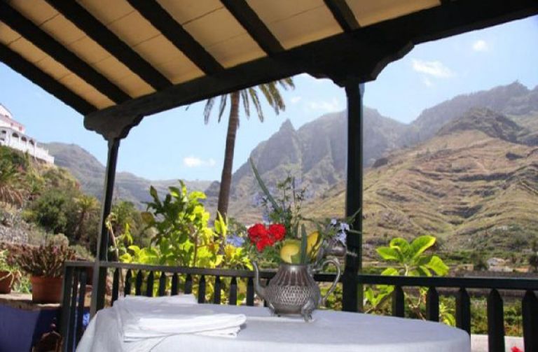 Vor dem Haus liegt die überdachte Terrasse mit Gartenmöbeln und einem herrlichen Blick auf das Tal, die Palmen und Berge. Der Internetzugang über Wlan ist kostenlos. |