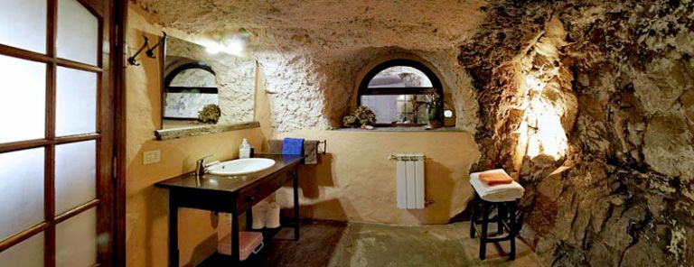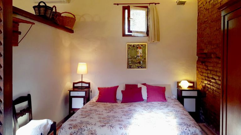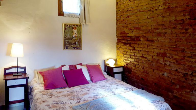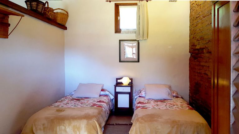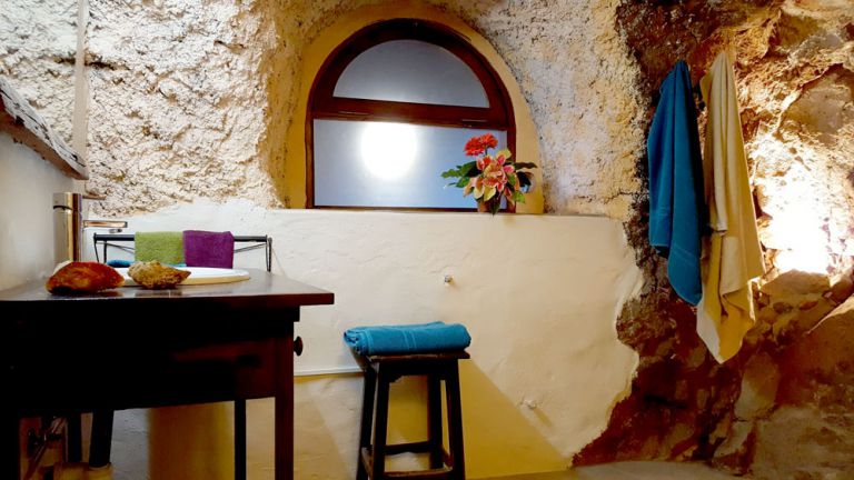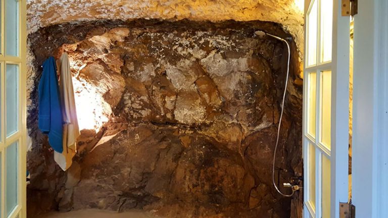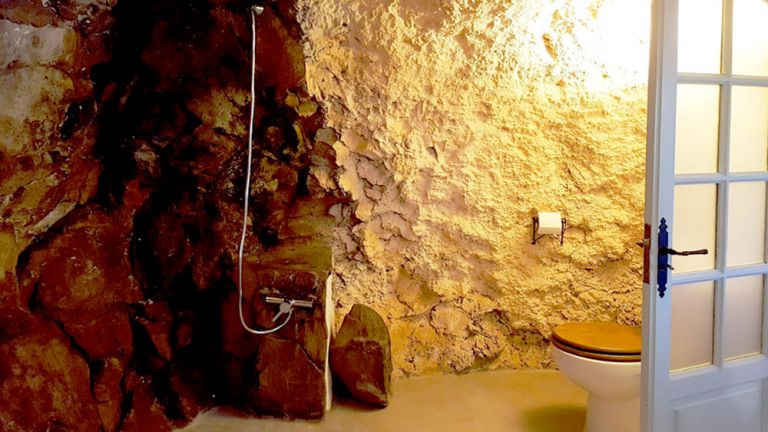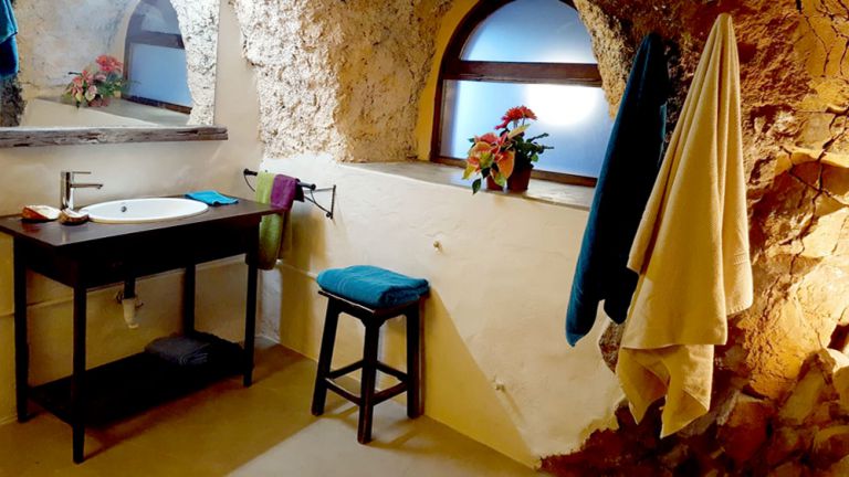 | Die Finca verfügt über ein Schlafzimmer mit zwei Einzelbetten, die zu einem Doppelbett zusammengestellt werden können. Das Duschbad ist bemerkenswert gestaltet und wurde in den Naturfelsen integriert. |