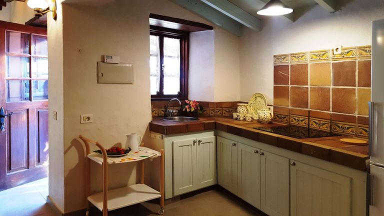 | Die angrenzende Einbauküche verfügt über ein Cerankochfeld, Backofen, einen Kühlschrank mit Gefrierfach, Kaffeemaschine, Espressokocher, Mixer, Toaster und Teekanne. | |||||