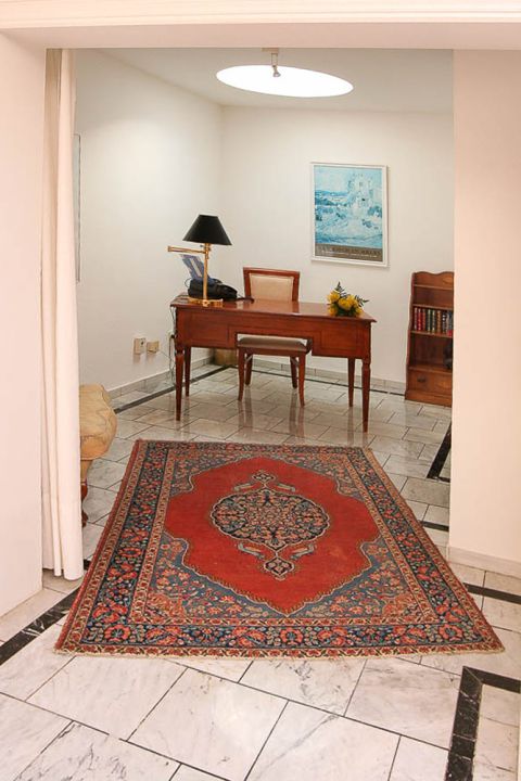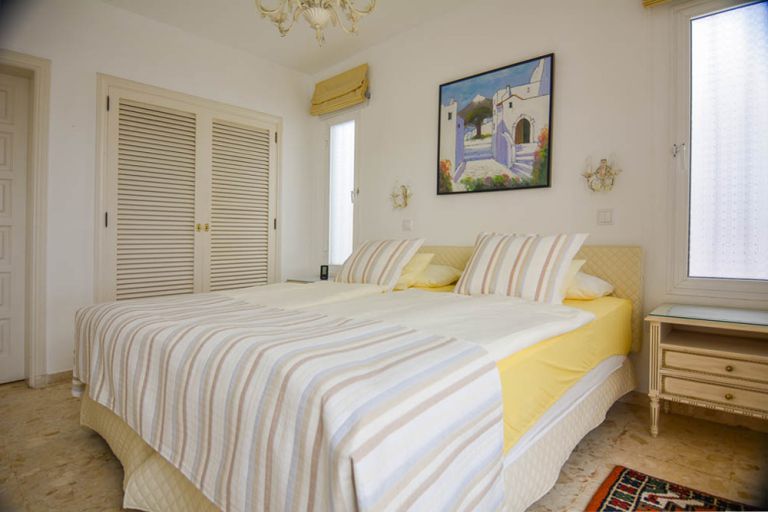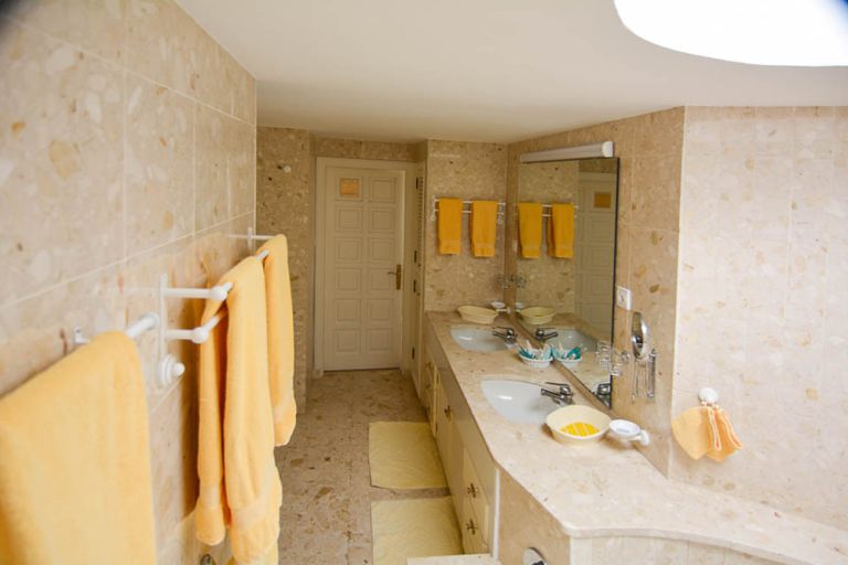 | Das Schlafzimmer verfügt über ein großes Doppelbett. Daran anschließend liegt das geräumige Marmorbad mit Glaskuppel. Außerdem gibt es ein separates WC mit Bidet und ein Gäste Duschbad mit WC. Bademäntel und Fön stehen zur Verfügung. | |||||