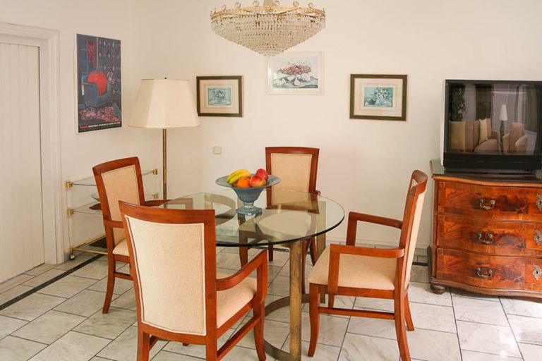 | Das Wohnzimmer mit einem Esstisch für vier Personen verfügt über einen Deko Kamin und eine hochwertige Couchgarnitur sowie SAT-TV. | |||||