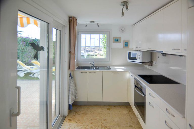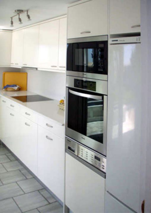 | Die moderne Einbauküche ist unter anderem mit einer Mikrowelle, Backofen mit Grillfunktion, einem Geschirrspüler und einer Waschmaschine ausgestattet. | ||