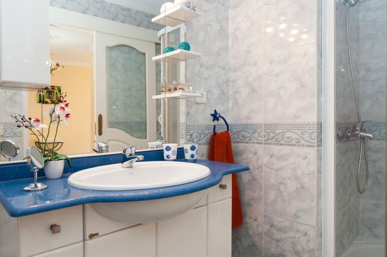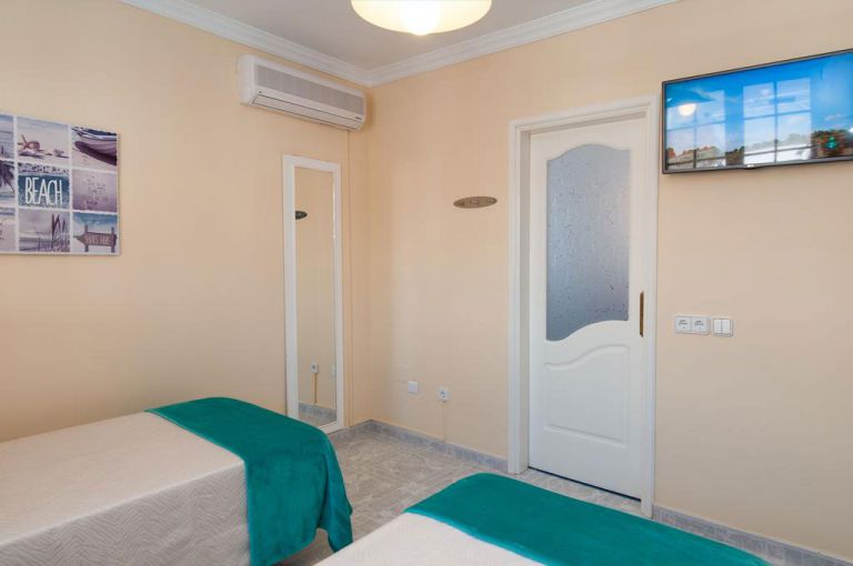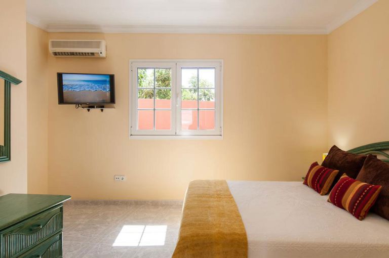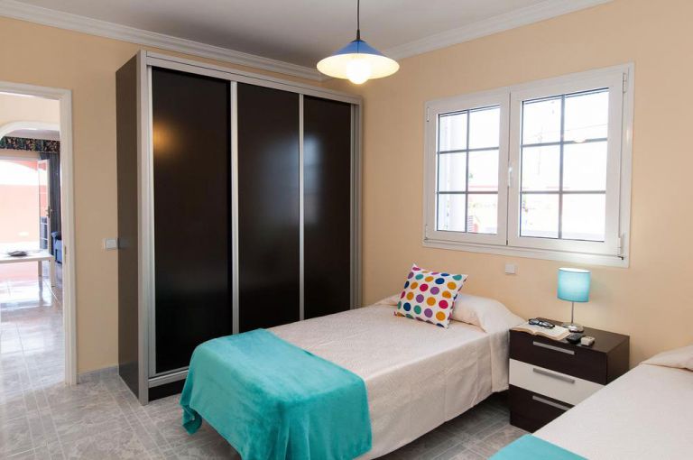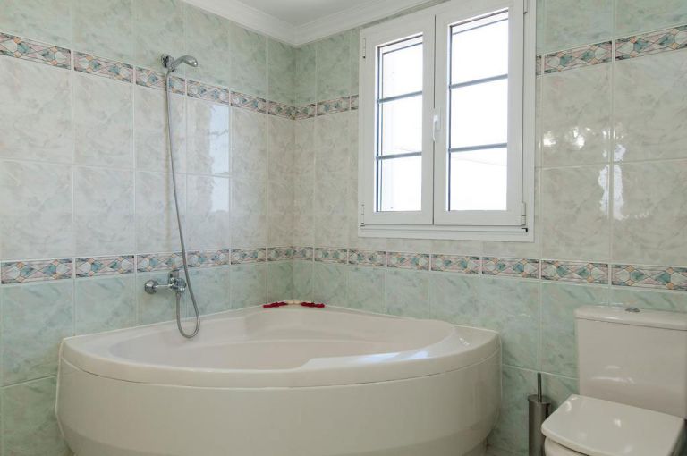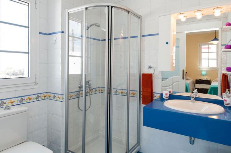 | Die Villa verfügt über 5 Schlafzimmer. Bei allen Betten handelt es sich um Einzelbetten der Größe 90 x 200, die zusammengestellt sind, bzw. zusammengestellt werden können und dann eine Größe von 180 x 200 ergeben. Drei Badezimmer sind mit einer Dusche ausgestattet, eines mit der Eckbadewanne mit Duschvorrichtung. Drei Schlafzimmer verfügen jeweils ein eigenes ensuite Badezimmer. |