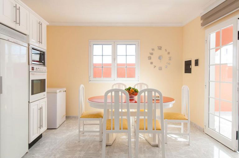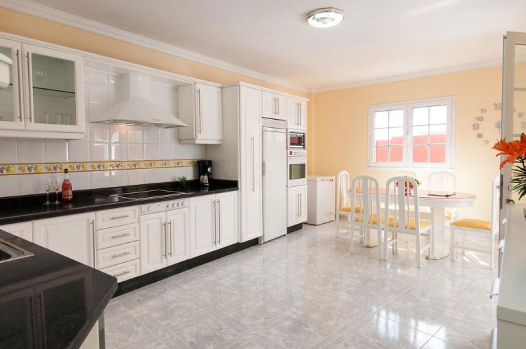 | Die großzügig angelegt Küche mit Esstisch ist mit allen elektrischen Haushaltsgeräten und Küchenutensilien ausgestattet, zum Beispiel mit Geschirrspüler, Cerankochfeld, Backofen, Mikrowelle und Kühlgefrierkombination. | |||||