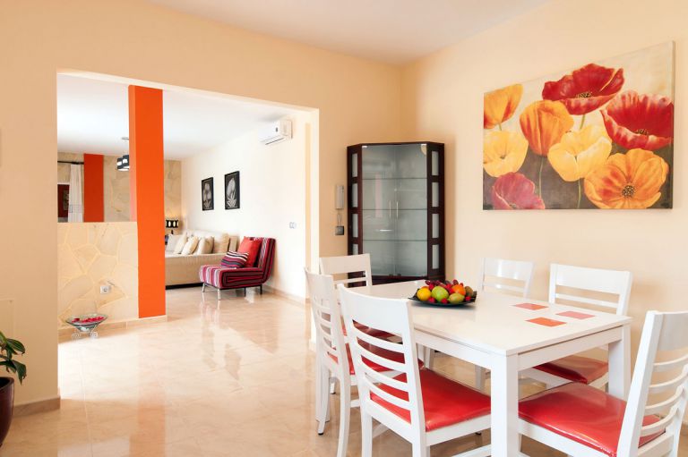 | Durch die Verwendung von rustikalen Steinen, viel Glas und Terrakottafarben ist die Villa harmonisch in die ländliche Umgebung integriert. Die Villa ist ebenerdig gebaut und bietet mit einer Wohnfläche von ca. 250 qm Platz für 8 Erwachsene und 1 Kleinkind. Sie verfügt über einen großzügigen Wohnbereich mit einer gemütlichen Couchgarnitur, SAT-TV, Stereoanlage, DVD-Player, Internetzugang und Klimaanlage. |