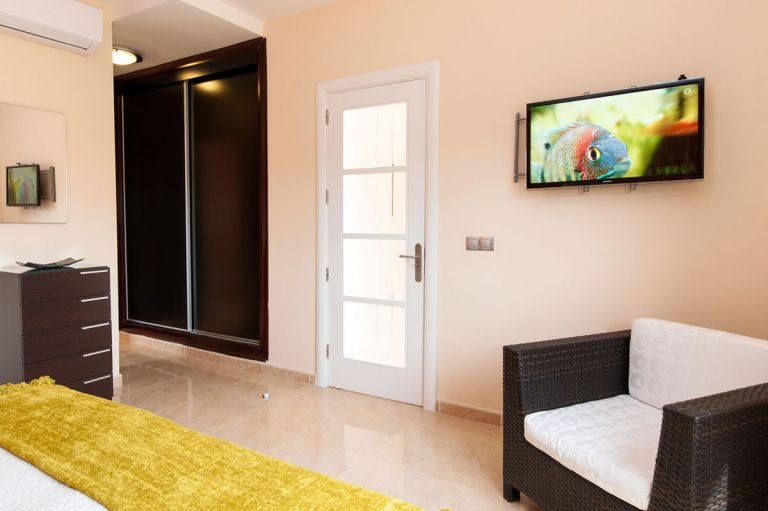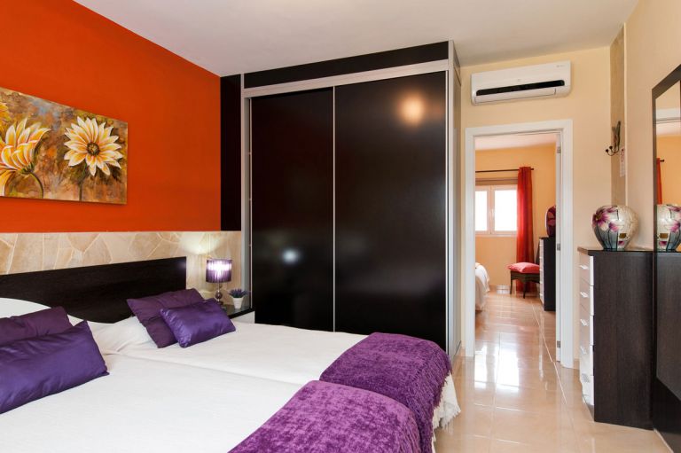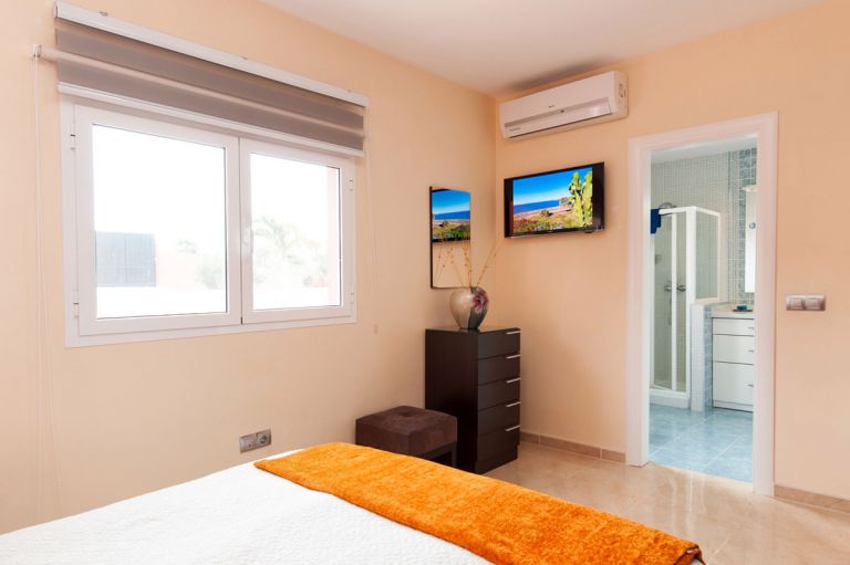 | Die Villa verfügt über 5 Schlafzimmer. Bei allen Betten handelt es sich um Einzelbetten der Größe 90 x 200, die zusammengestellt sind, bzw. zusammengestellt werden können und dann eine Größe von 180 x 200 ergeben. Die Schlafzimmer verfügen über große Kleiderschränke. Darüber hinaus stehen drei Badezimmer, zwei mit Dusche, eines mit Badewanne und Waschmaschine und ein Gäste WC zur Verfügung. Ein Zustellbett (200 x 200) kann zur Verfügung gestellt werden. |