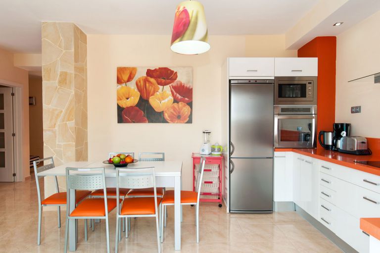 | Die moderne Einbauküche lässt keine Wünsche offen und verfügt über Backofen, Mikrowelle, Kühlgefrierkombination, Dunstabzugshaube und sämtliches erforderliche Küchenzubehör. Die Einbauküche hat einen integrierten Essplatz und ist zum Wohnzimmer hin offen. | |||||