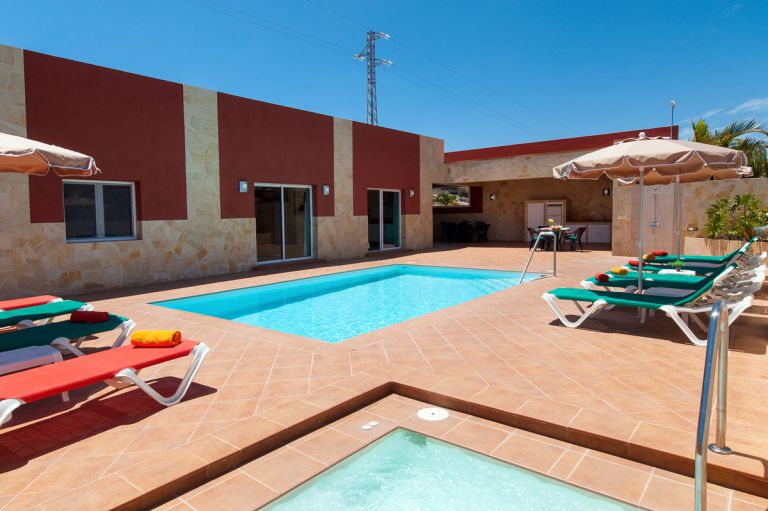| Im Garten gruppieren sich großzügige Terrassenflächen um den Pool und den Jakuzzi. Der elektrisch beheizte Pool hat eine Größe von ca. 7 x 4 m, der Jakuzzi bietet Platz für vier Personen. Es stehen sechs bequeme Sonnenliegen und ein Sonnenschirm für Sie bereit. Da in Maspalomas fast immer die Sonne scheint, werden Sie bestimmt viel Zeit draußen verbringen und dabei die Annehmlichkeiten der Außenküche mit Cerankochfeld, Kühlgefrierkombination und Spülbecken genießen und können dank des großen gemauerten Außengrills zünftige Grillabende veranstalten. Der Grillbereich ist überdacht und hat zwei Esstische mit Sitzplätzen für acht Personen. Zum Außenbereich gehört ein Gäste - WC mit Waschmaschine. | |||||