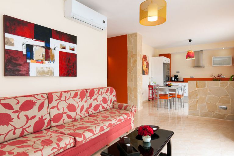| Der gemütliche Wohnraum hat einen direkten Zugang zur Terrasse und ist mit einer bequemen Sitzgarnitur, SAT - TV mit Plasmabildschirm, DVD - Spieler und Klimaanlage ausgestattet. | |||||