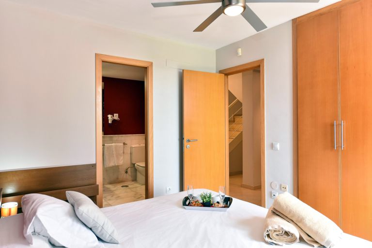 | Ein Schlafzimmer verfügt über ein Doppelbett, das andere über zwei Einzelbetten und geräumige Kleiderschränke. Für ein Kind unter 2 Jahre stehen auf Anfrage ein Babybett und ein Hochstuhl zur Verfügung. Die geschmackvollen Badezimmer sind im Erdgeschoss mit einer geräumigen, ebenerdigen Dusche und im Obergeschoss mit einer Badewanne ausgestattet. Ein Bügeleisen und Bügelbrett sind vorhanden. |