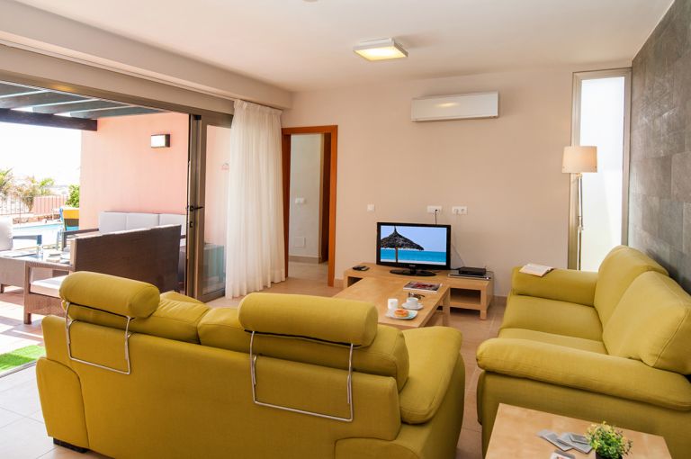 | Das Wohnzimmer verfügt über zwei bequeme Sofas, SAT-TV, Stereoanlage, DVD-Player und Ipod-Station. Vom Wohnzimmer aus gelangen Sie direkt auf das große Grundstück mit Pool. Im ganzen Haus sorgt eine Klimaanlage für angenehme Temperaturen. |