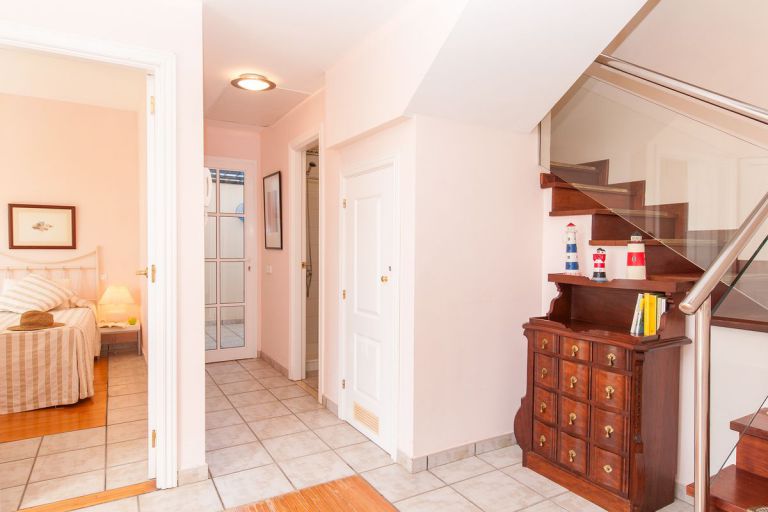 | Eines der drei Schlafzimmer ist mit einem Doppelbett, die anderen zwei sind mit Einzelbetten ausgestattet. Ein Schlafzimmer befindet sich in Parterre, die anderen zwei im ersten Stock. Die Schlafzimmer im ersten Stock haben einen Balkon. Ein Schlafzimmer hat darüber hinaus eine Sofaecke. | |||||