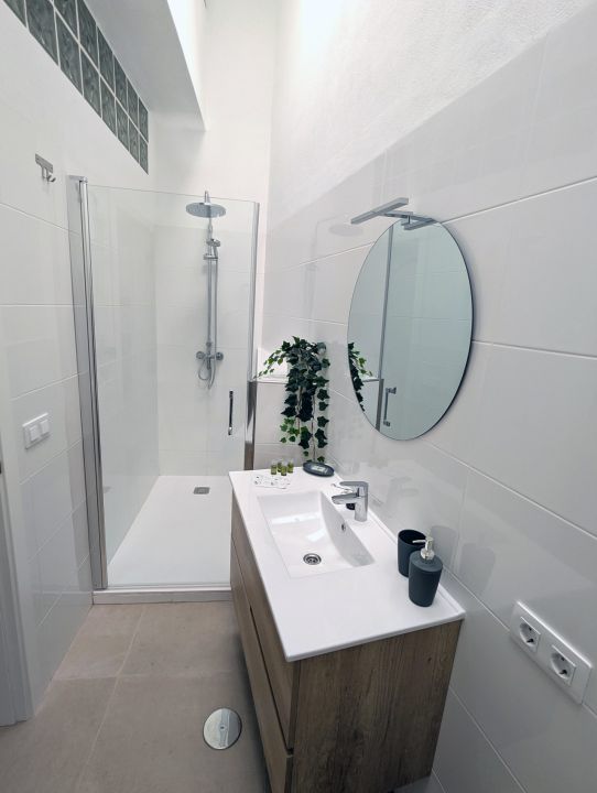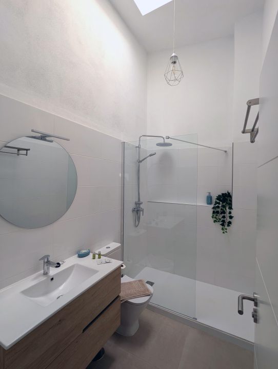 | Die beiden modern ausgestatteten Badezimmer mit Tageslichtfenster verfügen über ebenerdige Duschen mit Glasabtrennung, beide mit Shower- und Handduschen ausgestattet. Zudem jeweils über einen geräumigen Waschtisch mit großem Spiegel und Schubfächern sowie WC. In beiden Badezimmer liegen moderne Bodenfliesen. |