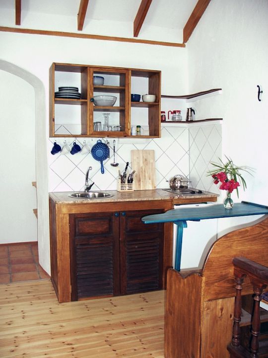 | Beide Ferienhäuser erstrecken sich über zwei Ebenen. Auf der ersten Ebene befindet sich der Flur, die Wohn - Essküche mit einem Zweiplattenherd und Musikanlage, der Ruhebereich, ein Balkon mit Meerblick und ein Badezimmer. Über eine Wendeltreppe erreichen Sie das darunter liegende Schlafzimmer mit einem Doppelbett (160 x 200). | ||