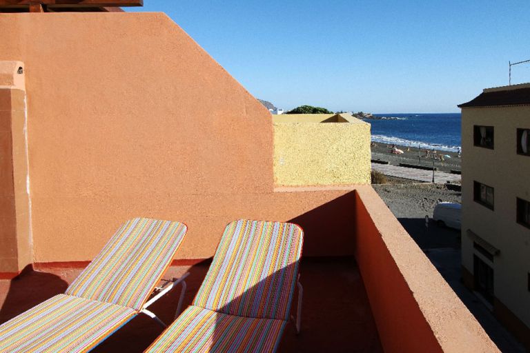 | Die Ferienwohnung und das Studio liegen im Zentrum von La Playa. Direkt schräg gegenüber beginnt die Strandpromenade mit Cafés, Restaurants, Supermarkt, Geschäften und dem schwarzen Sandstrand. Mit ca. 50 / 30 qm sind die Ferienwohnung und das Studio für bis zu 6 Personen geeignet. Das Studio liegt in der ersten Etage und die Ferienwohnung in der darüber liegenden obersten Etage eines kleinen Hauses. Im Erdgeschoss befindet sich das Büro einer Autovermietung. | ||