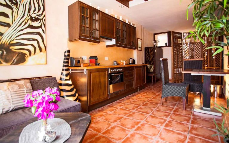 | Die angrenzende Einbauküche mit einem Esstisch ist mit einem Vierplatten Cerankochfeld, Backofen, Kühlschrank, Kaffeemaschine, Wasserkocher und einem spanischen Espressokocher ausgestattet. | ||