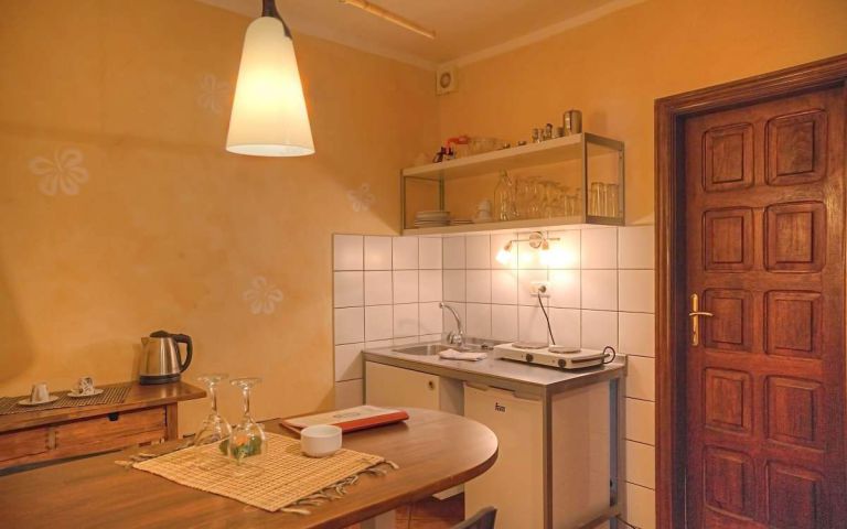| Der Wohnraum verfügt über eine Schlafcouch mit Couchtisch, einen Sekretär, Internetzugang über Wlan und SAT-TV. Daran schließt sich die Kitchenette mit einem Esstisch, Kühlschrank und einem Zweiplattenherd an. Darüber hinaus verfügt die Wohnung über ein separates Schlafzimmer mit einem Doppelbett (180 x 200) und Kleiderschrank. Das Badezimmer ist mit Dusche, Waschbecken und WC ausgestattet. Ein Fön kann auf Wunsch zur Verfügung gestellt werden. |